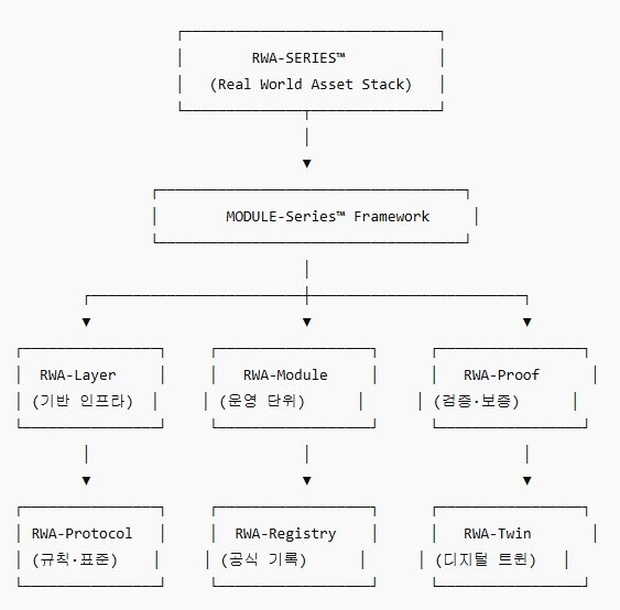 RWA 생태계를 ‘운영 가능한 단위’로 나누어 국가·은행·기관이 독립적·안전하게 운영할 수 있도록 하는 구조적 아키텍처. 즉, RWA를 작동시키는 최소 단위(Operational Unit) 이다. 📌 MODULE-Series™ 핵심 구조 (도식형) 아래는 전체 구조를 한눈에 볼 수 있는 텍스트 기반 다이어그램이다. ![]() 🔷 도식형 구조 해설 1) RWA-Layer (레이어 구조)